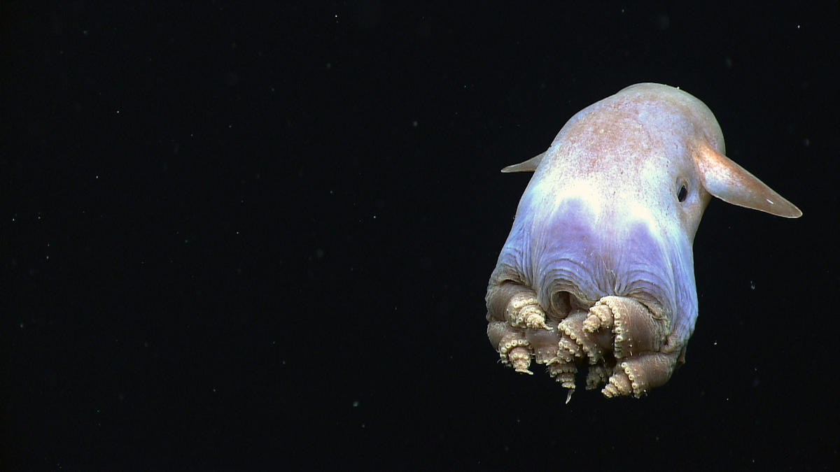 Some say this lemur is the manifestation of child nightmares, others say it evolved from rodents, and still some believe it is a distant relative of primates like us. While the origins of this freakish mammal are debated, what is certain is that the Aye-aye (Daubentonia madagascariensis) is a nocturnal, tree dwelling creature that eats seeds, fruits, nectar, and bugs. Its hunting and gathering method is particularly strange. Like the woodpecker, the aye-aye uses “percussive foraging” to find its food. This means it spends its nights rapidly knocking on tree trunks (8-10 times per second) until the sound notifies them of a chamber of grubs. It then gnaws at the wood, exposes the insects and uses its perfectly adapted bony middle fingers to extract the catch of the day.Dumbo Octopus - Deep Oceans
